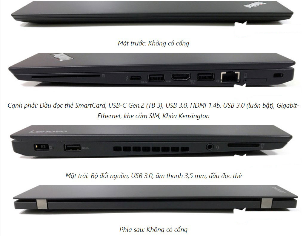 Cải tiến cũng như thay đổi lớn của T470s so với T460s đó là sự xuất hiện của cổng USB-C / Thunderbolt 3 có thể được sử dụng để sạc máy tính xách tay kết hợp với công nghệ sạc “Anti-Fry” bảo vệ của Lenovo. Đầu đọc thẻ SD, cổng HDMI xuất hình ảnh và cổng mạng LAN là những cổng đáng chú ý của máy. Ngoài ra máy có 3 cổng USB 3.0, số lượng vừa phải cho người dùng văn phòng...