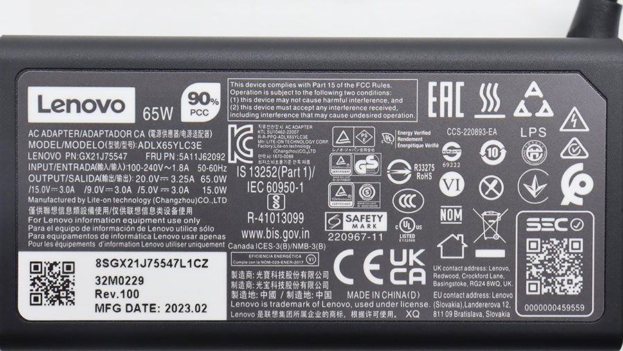 THÔNG SỐ KỸ THUẬT Sạc Laptop Lenovo ADLX65YLC3E Type-C 65W